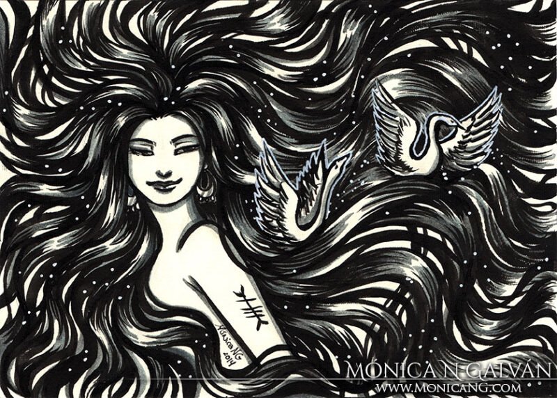 A lake nymph with flowing hair like water. She takes the form of a swan. Postcard (105 x 148 mm – 4.1 x 5.8 in) India Ink, markers, white gel pen over textured ivory cardstock.