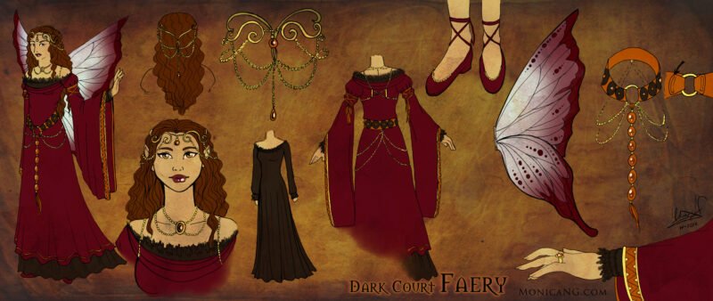 Dark Court Faery dress design. Made of red blood velvet, coal satin with details of gold & amber with amber/crystals and stones. The orange colors on other dress parts are brocade, and the borders of black underwear are made with black lace. —- Anyone can use this design for make a costume, just note me…